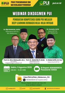 Jakarta – Dalam rangka mendukung implementasi kebijakan pendidikan nasional dan memperkuat peran guru dalam menjawab tantangan abad ke-21, Dewan Pengurus Pusat Persatuan Ummat Islam (PUI) melalui Bidang Pendidikan Dasar dan Menengah (Dikdasmen) akan menggelar webinar nasional bertajuk “Penguatan Kompetensi Guru PUI melalui Deep Learning Berbasis Nilai-Nilai Intisab”. Kegiatan ini akan berlangsung pada Sabtu, 9 Agustus 2025 pukul 08.30–11.30 WIB melalui platform Zoom Meeting.