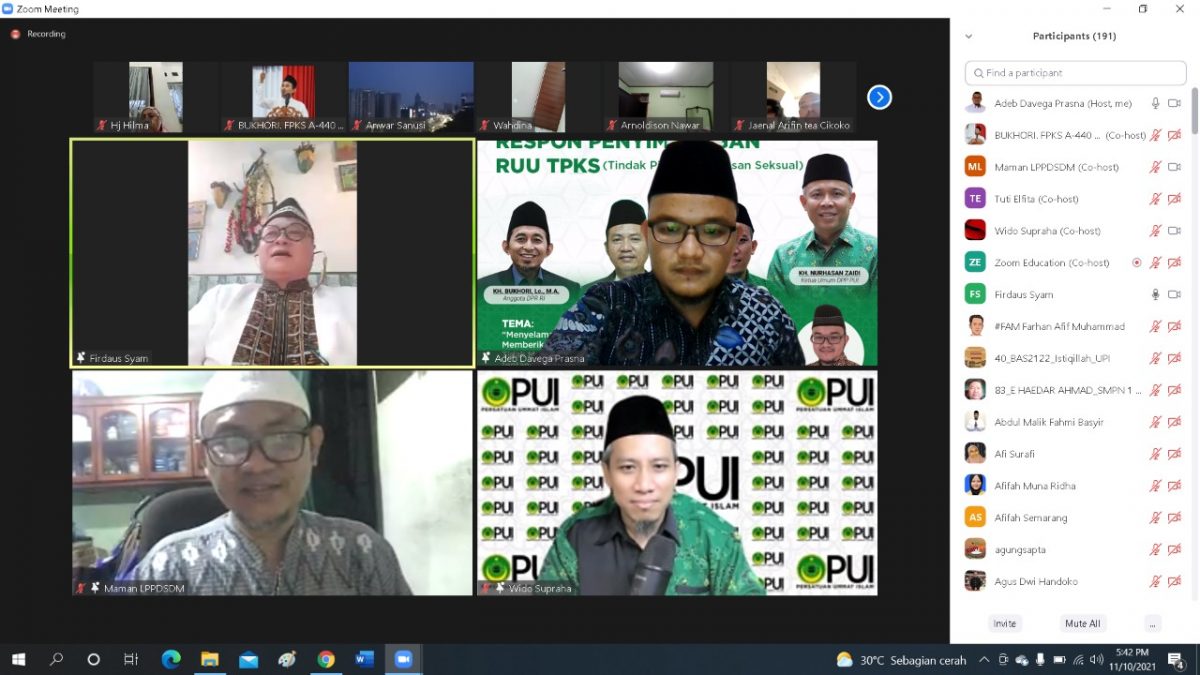 PUI.OR.ID, JAKARTA – Dewan Pengurus Pusat Persatuan Ummat Islam (DPP PUI) menyelenggarakan Webinar Respon Penyimpangan RUU TPKS (Tindak Pidana Kekerasan Seksual) dengan tema “Menyelamatkan Generasi Muda dari Perzinahan dan LGBT dengan Memberikan Dukungan kepada Anggota DPR RI agar RUU TPKS Tidak Menyimpang dari Pancasila dan UU No. 39 Tahun 1999 tentang Hak Asasi Manusia†pada Rabu (10/2021) pukul 15.30 WIB, yang diikuti 240 peserta secara daring.