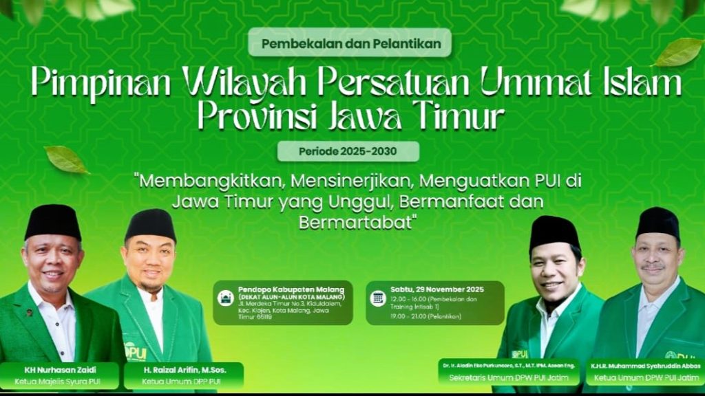 Malang — Dewan Pengurus Pusat Persatuan Ummat Islam (DPP PUI) resmi melantik jajaran Pimpinan Wilayah (PW) PUI Jawa Timur periode 2025–2030 di Pendopo Kabupaten Malang, Jawa Timur, pada Sabtu (29/11/2025). Momentum ini menandai babak baru penguatan dakwah, pendidikan, sosial, serta pemberdayaan umat di Jawa Timur.