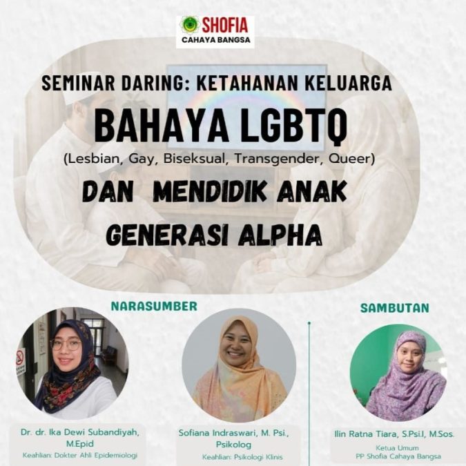 Jakarta – Pengurus Pusat (PP) Shofia Cahaya Bangsa menyelenggarakan seminar online bertajuk “Bahaya LGBTQ dan Mendidik Anak Generasi Alpha” pada Kamis, 29 Mei 2025, yang diikuti oleh 70 peserta dari berbagai wilayah di Indonesia. Acara ini menghadirkan dua narasumber kompeten, yaitu Dr. dr. Ika Dewi Subandiyah, M.Epid, seorang dokter ahli epidemiologi, dan Sofiana Indraswari, M.Psi, Psikolog, yang berfokus pada psikologi klinis.