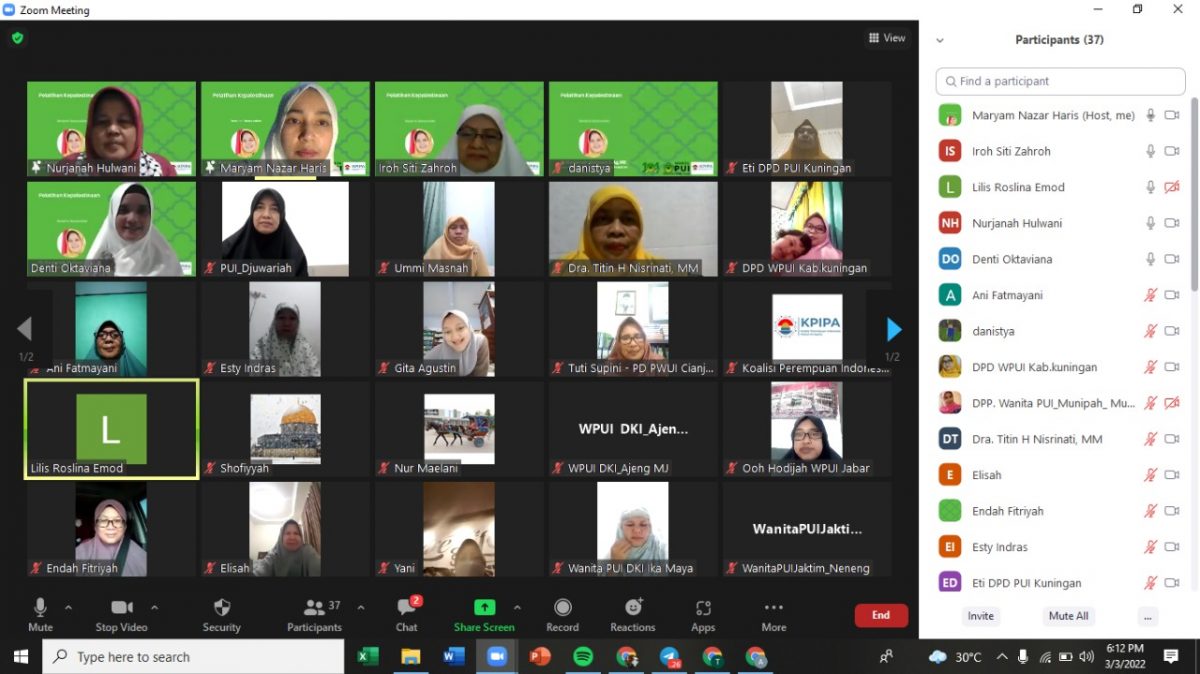 PUI.OR.ID – Alhamdulillah, telah terlaksana dengan lancar Webinar ‘Pelatihan Peduli Palestina’ yang digagas oleh Dewan Pengurus Pusat (DPP) Wanita Persatuan Ummat Islam (Wanita PUI) pada Kamis, 3 Maret 2022. Kegiatan ini terlaksana atas kerjasama dengan Koalisi Perempuan Indonesia Peduli Al Aqsha (KPIPA), dengan narasumber utama Ibu Hj. Nurjanah Hulwani S.Ag., ME., selaku Ketua KPIPA.