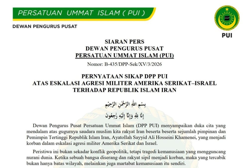 Dewan Pengurus Pusat Persatuan Ummat Islam (DPP PUI) menyampaikan duka cita yang mendalam atas gugurnya saudara muslim kita rakyat Iran beserta sejumlah pimpinan dan Pemimpin Tertinggi Republik Islam Iran, Ayatollah Sayyid Ali Hosseini Khamenei, yang menjadi korban dalam eskalasi agresi militer Amerika Serikat dan Israel.
