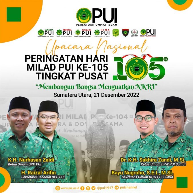 “Dewan Pengurus Pusat PUI akan menggelar Upacara Peringatan Milad PUI Ke-105 tingkat pusat pada 21 Desember 2022 ini di Sumatera Utara,” kata Sekretaris Jenderal DPP PUI H Raizal Arifin di Jakarta, Selasa (20/12/2022).