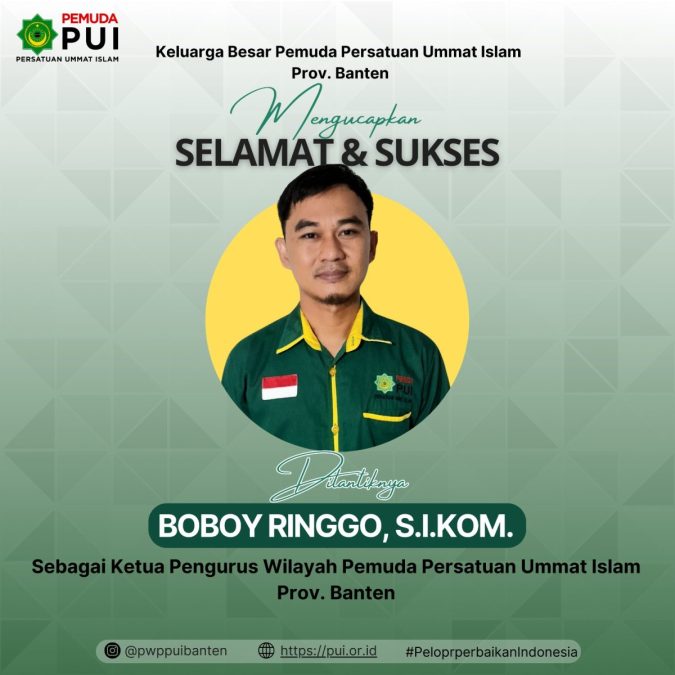 PUI.OR.ID, BANTEN – Pengurus Wilayah (PW) Pemuda Persatuan Ummat Islam (PUI) Provinsi Banten resmi dilantik pada Senin, 06 Mei 2024. Ketua Umum PP Pemuda PUI, Dr Mas Kana Kurniawan, MAHk mengukuhkan Boboy Ringgo, S.I.Kom sebagai Ketua PW Pemuda PUI Banten dan jajaran pengurus untuk masa bakti 2024-2027.