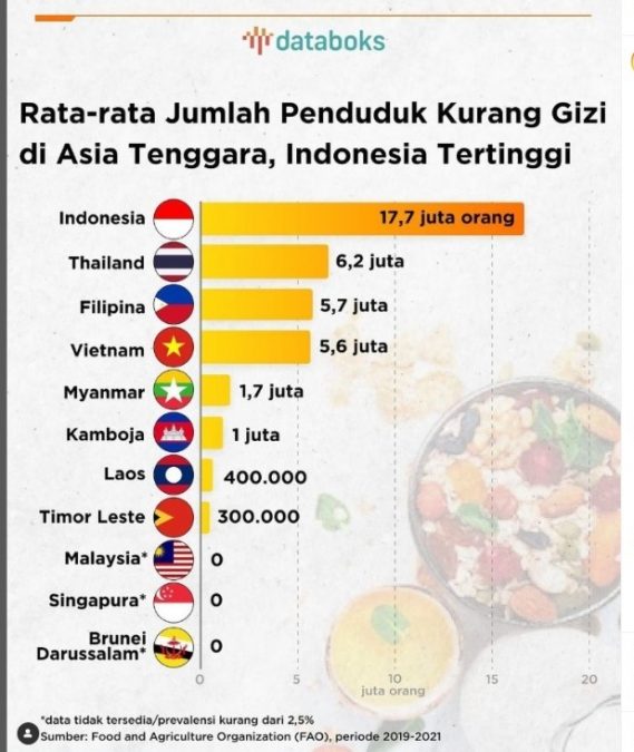 Data FAO yang dikutip Databoks menunjukkan, sebanyak 17,7 juta warga Indonesia dari 270 juta penduduknya hidup dalam kekurangan gizi. Di bawahnya, warga Thailand yang kekurangan gizi sebanyak 6,2 juta, Filipina 5,7 juta, Vietnam 5,6 juta, Myanmar 1,7 juta, dan Kamboja 1 juta.