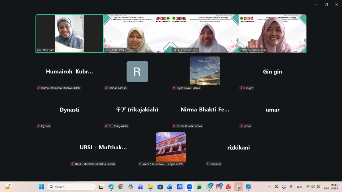 Webinar nasional bertajuk “Analisis Linguistik terhadap Pornografi, Pornoaksi, dan Bahasa: Ancaman terhadap Keluarga” diselenggarakan secara daring yang diikuti oleh puluhan peserta pada hari Ahad (30/11/2025) oleh Bidang Kajian dan Sumber Daya Manusia Pengurus Pusat Shofia Cahaya Bangsa. Kegiatan ini menghadirkan Ripta Permata Nuary, M.Hum., dosen linguistik STAI Siliwangi Bandung, sebagai narasumber utama dan dibuka dengan sambutan Ketua Umum PP Shofia Cahaya Bangsa, Ilin Ratna Tiara, S.Psi.I, M.Sos.