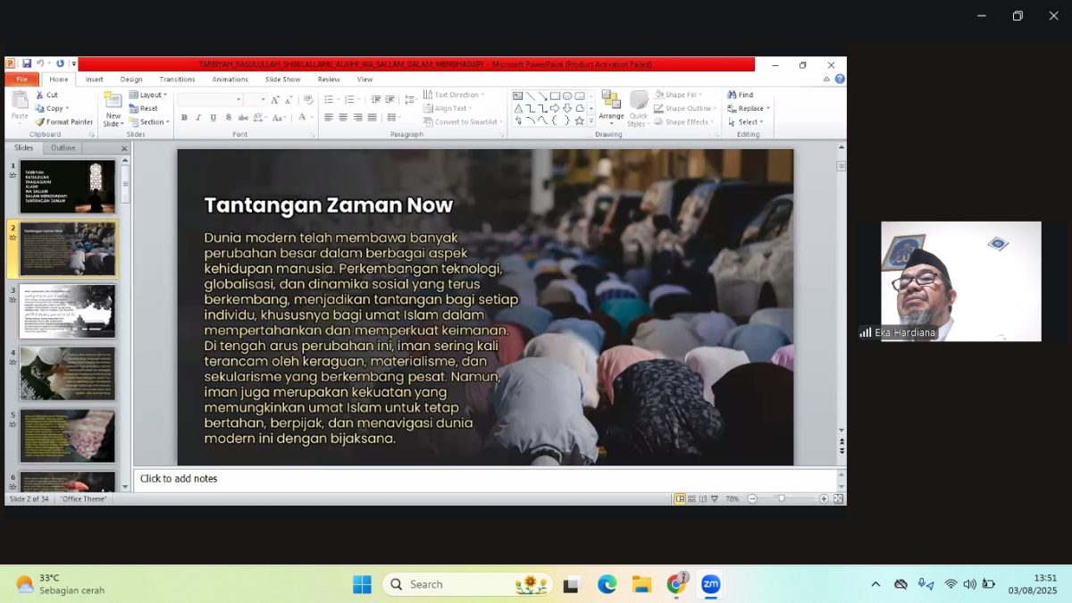 Dalam penyampaian materinya, Ustadz Eka menjelaskan bahwa “Di tengah berbagai tantangan yang ada, pendidikan agama memegang peran yang sangat penting dalam memperkuat iman umat Islam. Pendidikan agama yang baik akan mengajarkan umat Islam tentang pentingnya iman sebagai dasar kehidupan, yang tidak terpengaruh oleh perubahan zaman. Pendidikan agama juga mengajarkan umat untuk mampu menilai dan menyaring informasi yang datang dari berbagai sumber, serta menerapkannya sesuai dengan prinsip-prinsip Islam.